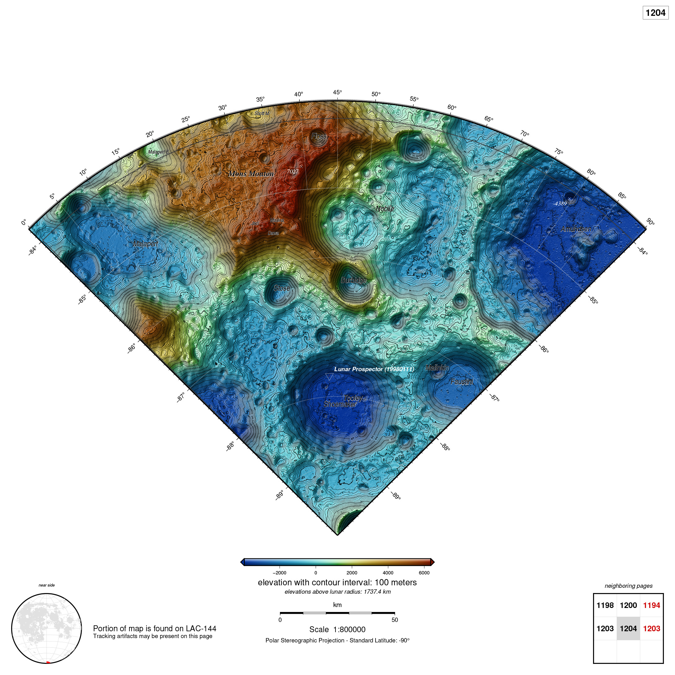 The atlas consists of 1204 individual topographic maps covering the entire near-side of the Earth’s Moon and providing graphical representations of the Moon’s surface at unprecedented levels of detail. A scale of 1:500,000 was adopted for all maps, with the exception of the polar maps which were set at 1:800,000. The maps were created on the basis three lunar Digital Elevation Models (DEMs) developed by NASA.