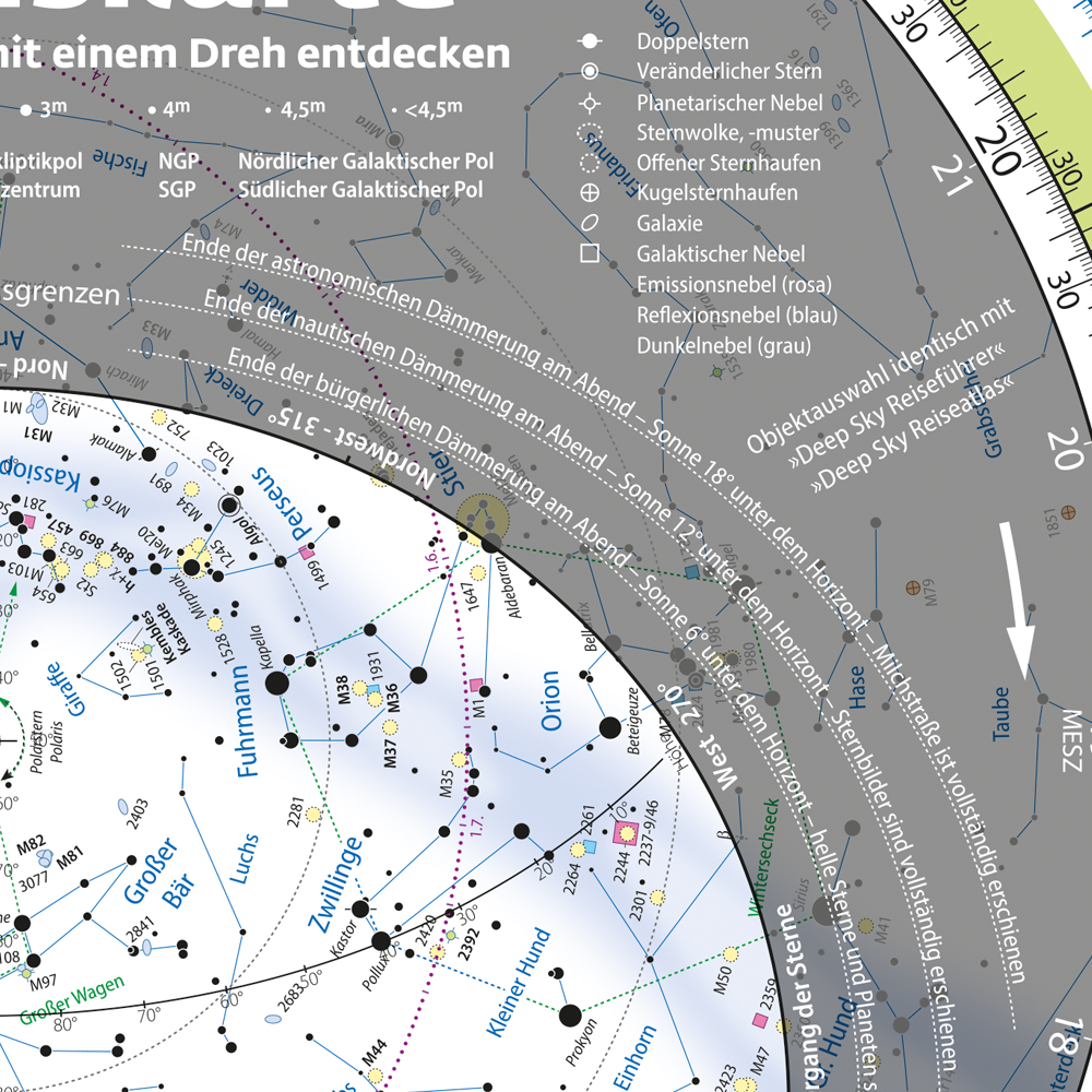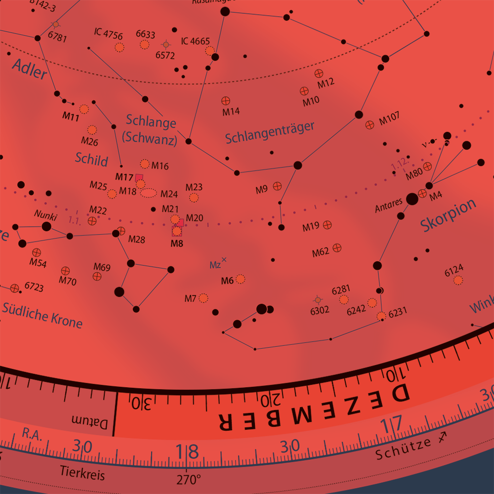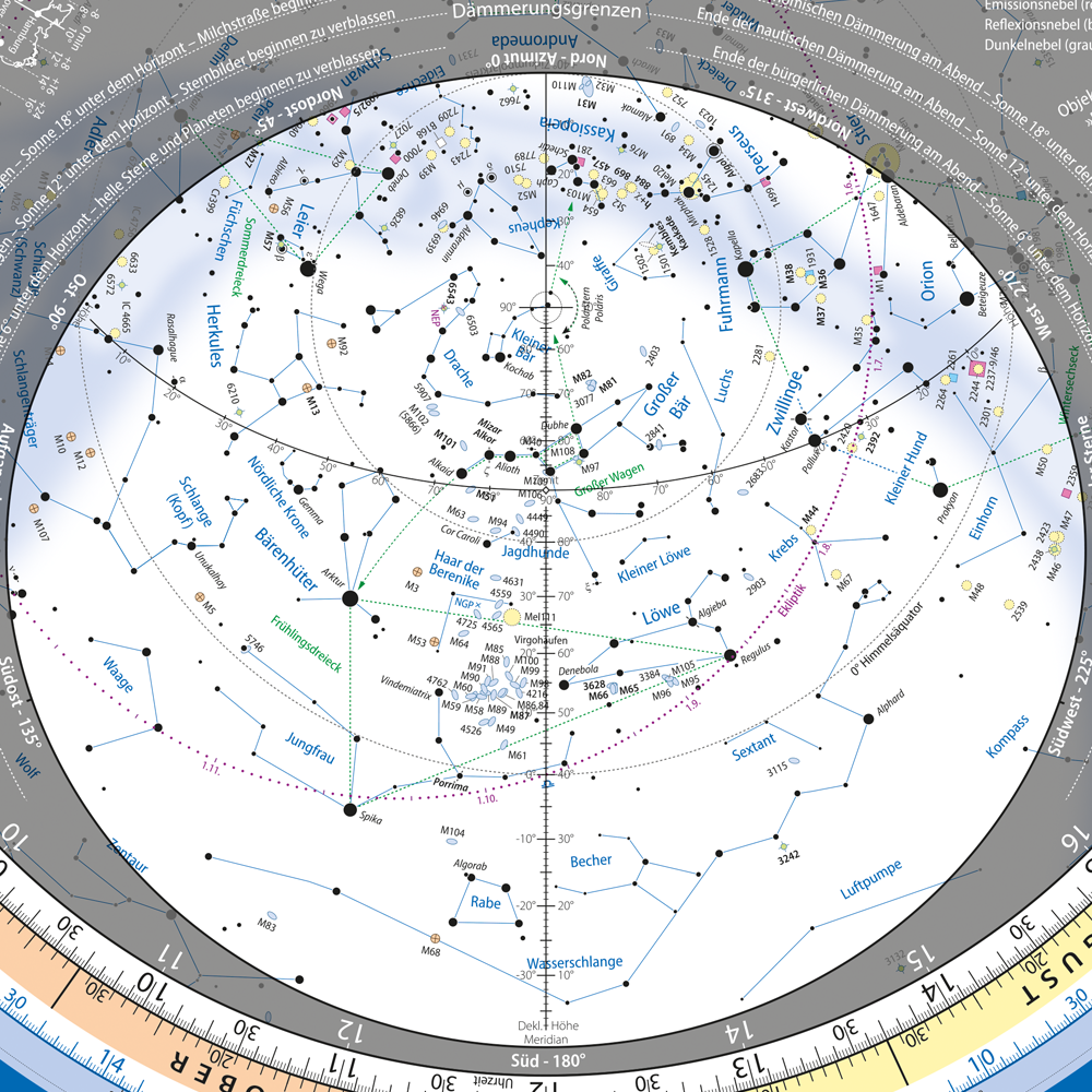• Beschriftete Skalen für Tierkreis, Rektaszension, Datum und Uhrzeit