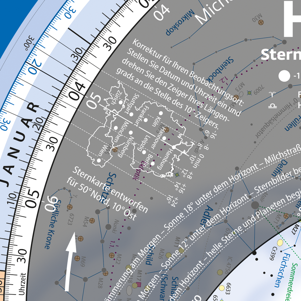 Ob zu Hause, auf dem Balkon oder beim Beobachtungsabend unter freiem Himmel: Mit nur einem Dreh zeigt die Karte, welche Sternbilder aktuell sichtbar sind und welche Deep-Sky-Objekte sich lohnen.