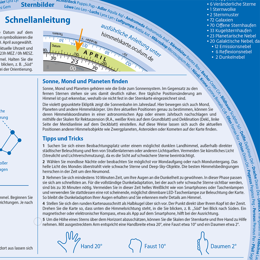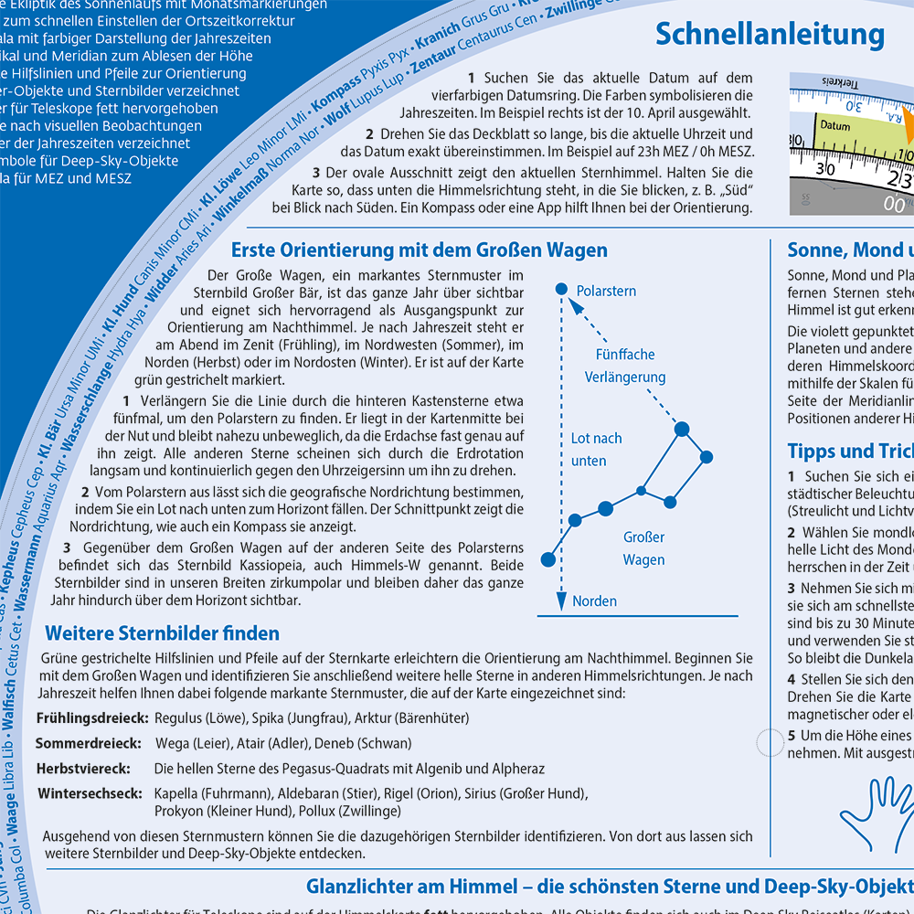 Die Rückseite enthält eine ausführliche Schnellanleitung sowie die Rubrik „Glanzlichter am Himmel“. Dort werden die schönsten Sterne und Deep-Sky-Objekte der Sternkarte beschrieben. Zusätzlich finden sich Termine für Sonnenwenden, Tagundnachtgleichen und die wichtigsten periodischen Sternschnuppenströme.